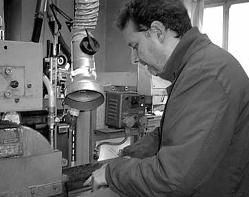To carry out this operation, a carefully designed profile must be set up on a metal shape. This shape will direct the grindstone, so it will remove the steel from the tongue to achieve the required tongue shape. This photo shows the metal shape on which the tongue profile is ground.