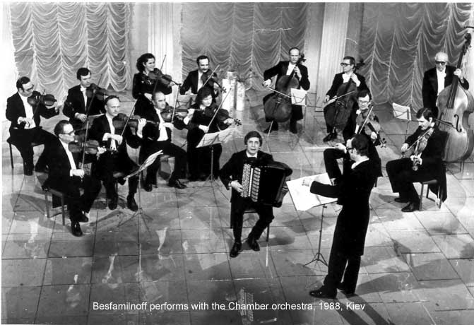 Merit Award.In the Ukraine, Vladimir Besfamilnov was the first international prizewinner on the accordion, the first accordionist to tour nationally and internationally as a soloist, the first to perform concertos with symphony orchestras, chamber wind and entertainment orchestras. As an accordion solosist he was first to be awarded the titles "Honoured Artist of Ukraine" and "Peoples Artist of Ukraine" by the State. Video 1: Video 2: Video 3: