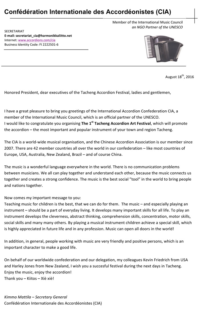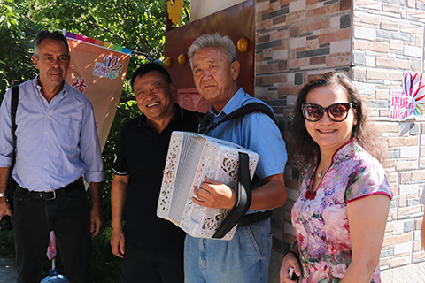| Upper left: Chairman of the Culture Center - Zhang Yan, Ding Peng and President of the Tacheng Government - Ruo Man-Tawuhan talking to CIA Ambassador Kevin Friedrich and CIA General Secretary Kimmo Mattila about the plans for a magnificent new Accordion Museum which will house and display 2,000 instruments! Upper Right: Zhang Li Yan (Tourism Board of Tacheng) welcoming guests. |