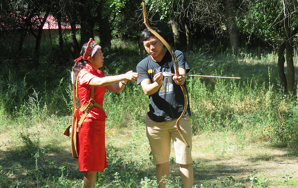 | The official from the Guinness Book of World Records in Beijing getting some guidance in bow and arrow shooting from expert performer and now university teacher Jiang Bolong. | |