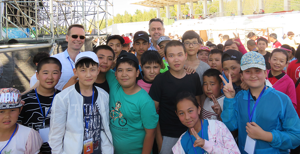 | Kimmo Mattila (CIA General Secretary) and Kevin Friedrich (CIA Ambassador) with many of the young accordionists who will participate in the world record attempt, to be conducted at the Closing Ceremony. |