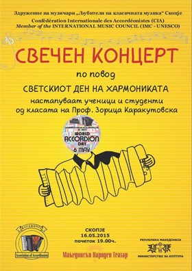 The international project "May 6th World Accordion Day" is supported by the Macedonian Association of Accordionists with successful realization of concerts at home and abroad.