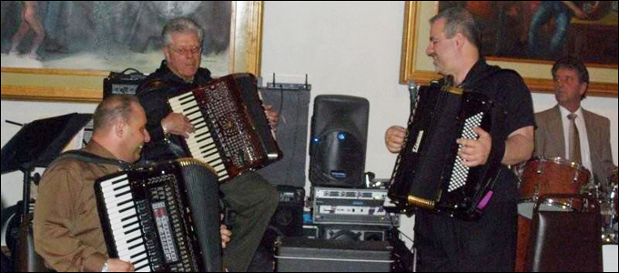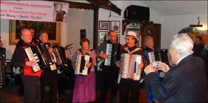 AAA President Linda Reed, MC Lenny Feldmann with fellow accordionists |