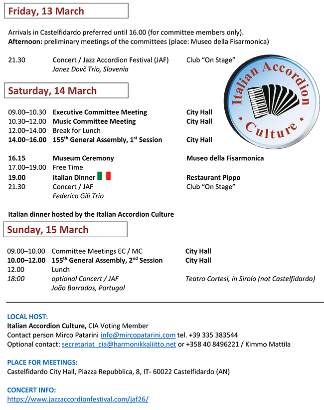Welcome to the 2026 Winter Congress and 155th General Assembly of Delegates to be held in Castelfidardo, Italy. The Winter Congress is being hosted by our CIA Voting Member Italian Accordion Culture (IAC) organized by Mirco Patarini.
