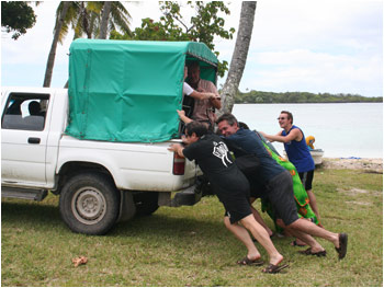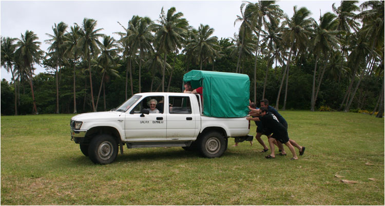 Members hard at work trying to push start the only transportation