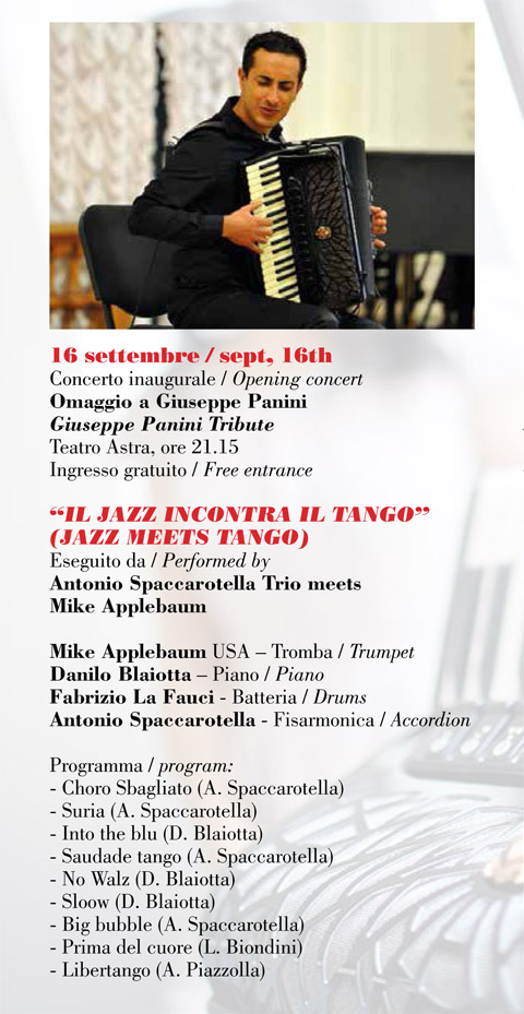 21.15 | Sala T | Teatro Astra via Matteotti 34 | Il Jazz incontra il tango “Antonio Spaccarotella Trio meets Mike Applebaum” |