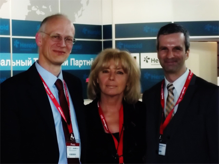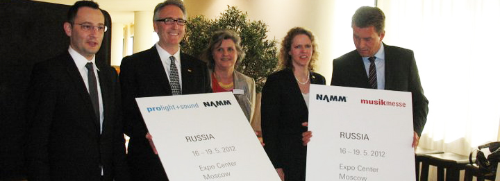 Messe Frankfurt and NAMM FOR IMMEDIATE RELEASE Announcement “NAMM Musikmesse and Prolight + Sound NAMM Russia and will take place in ‘s Expo Centre from 16 to 19 May 2012″ Messe Frankfurt Geschäftsführer Detlef Braun and Director of International Affairs at NAMM Betty Heywood on right holding sign, left sign with NAMM President CEO Joe Lamond and Messe Frankfurt Bereichsleiterin Cordelia von Gymnich at special Press Conference in Presse Center at 2011 Musikmesse with introduction by Christine Kern Pressearbeit: Textilmessen, Musikmesse – Jon Hammond Reporting HammondCast KYOU Radio |
