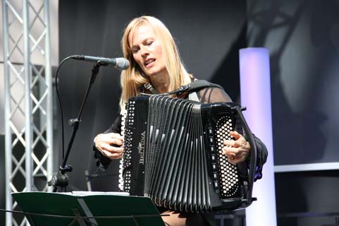 | Christine Schmid performing on the UNPLUGGED STAGE with her new | Beltuna Accordion in front of a huge crowd admiring not only her accordion playing, her vocal, but also her stage dress | |