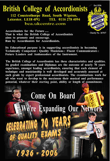 in the coming years. We also mark the sad passing of former NAO Deputy President and Past Chairperson Ronald Beecham in June. The College has already had the opportunity to award 1 LBCA Diploma this year in Malta, see 2 new BCA Centres held in Marlborough and Norwich and announce the release of a 3rd Aural Perception book with CD in preparation for diploma examinations. We are also delighted to see the significant promotion of the College in the very established magazine "Accordion Times International" which is now in the hands of Governing Council member Gina Brannelli. So as the British College of Accordionists celebrates its 70th anniversary with this reunion on the 24th September, the BCA Governing Council would like record our thanks to our young performers on the day, Andrew Hesslewood (Sir James Anderton Award of Excellence recipient 2005), Alexander Bodell, Julie Langton, Faye Ventre and Robert Thorne and thanks to all the examiners, local representatives teachers and candidates for their support over the last decade to ensure that the candidature for BCA examinations continues to flourish. |
