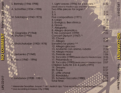 Lips has always shown an interest in building the concert repertoire of the bayan. He has provided inspiration to composers and, in addition, guidance by working with them in the final realization of the pieces, thereby making the repertoire not only suitable for the instrument but also playable. Of course, Friedrich Lips offers even more incentive to composers by giving the works their consummate performance whether recorded or in public concerts. The accordion/bayan players, now and in the future, must be extremely grateful for this growing list of additions to the serious repertoire. This CD has examples of several such original works, and all are by well-recognized composers who have made a significant contribution by composing for the bayan.
