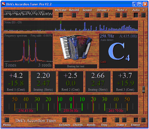 The Accordion Tuner is extremely accurate. The measuring error is less than 0.05 Hz (sound waves longer than 20 seconds). This accuracy makes it possible not only to measure single reeds, but also to measure multiple reeds at the same time and the beating frequencies between them. A special algorithm eliminates the need for calibration; the tuner is always accurate! The tuner software uses a microphone to measure the sound. Because the accuracy of the tuner is independent of the microphone, any microphone can be used, although to be able to measure the very low basses, a wide spectrum microphone gives better results. Dirk's Accordion Tuner ranges from the E0 (20.6 Hz) up to the C9 (8.4 kHz). The tuner can measure up to three reeds at the same time and also measure the beating frequencies that occur when multiple reeds with almost the same pitch sound together. This effect is called 'tremolo'. The characteristic sound of a specific accordion largely depends on the amount of beating for each note; the 'tuning' of the accordion. With Dirk's Accordion Tuner one can create and save lists with these beating frequencies, making it possible to save the tuning of an accordion in a computer file. The tuner software can use this file during the tuning process so every note will get exactly the right amount of 'tremolo'. Lookup tables are not needed for this anymore!