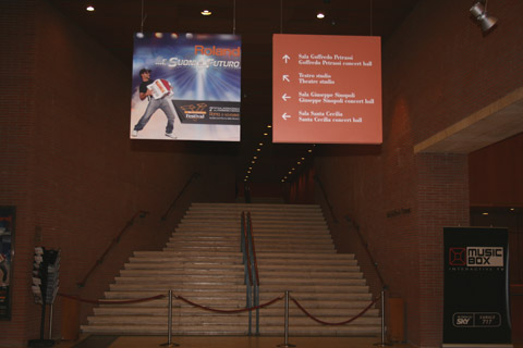 | Saturday involved two rehearsals at the concert venue, the beautiful Auditorium Parco della Musica Sala Petrassi. In the Foyer was a nice Roland display with very excellent graphics around and a video presentation as well. | Mimmo Vicari of Roland taking a break from setting up the Roland display. |