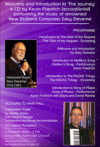 New York based Dargaville born accordionist Kevin Friedrich celebrated the release of his new CD 'The Journey' at a reception held at the Dargaville Methodist Church on Sunday, 4 October 2020. Attended by guests from around New Zealand, the Release Reception showcased the story behind the CD, introduced the composer, as well as presented four of the tracks found on the recording.