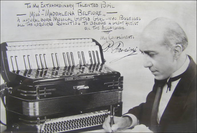one of his famous students. At that time, no one was afraid to travel. As young as we were, we had no fear of traveling. At first I would take my accordion, but later on I didn't. He let my try one that was at his house, and I could use it, so I would just borrow this for my lessons. An interesting thing about Frosini is that he liked to sew! He sewed the Raccoon hats (Davy Crockett hats). There he was with his needle sewing the tail on the back of the hat and we would just laugh looking at this stuff. He also had a little dog that was very cute. His wife was part of the Danish Opera Company, as she was Danish. After they married however, she really didn't sing any more. I studied with him from about 10 years old through college. He prepared me for my Carnegie Hall Recital. He was pretty sharp. A couple of times we had him over to the house. His wife would insist that his accordion would come along with him. She wouldn't ask him to play right way, but soon, she would say "Frous Frous are you gonna play?" the Belfiores are waiting for you to play.. and he would say.. "No no.. not yet " so she would get him on the side.. And give him a little 'medication' and he pepped up and he then put the accordion on, and he would start playing, and it was just absolutely amazing. He played Operas, he played Polka's, he played all kinds of music! His memory was phenomenal! In fact, we had him over the house a number of times. He had us over to his house too. He also had a summer place out on the Island, near Quiage, and he had his little fishing boat. He loved to go out on his fishing boat! That was one of his things, so a couple of times, he took my father with him. |