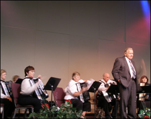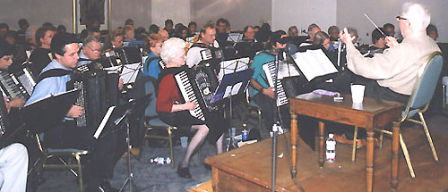 ATG Festival Accordion Orchestra rehearsal 1998, prominent in the picture are Kevin Friedrich and Joan Sommers. ![]()