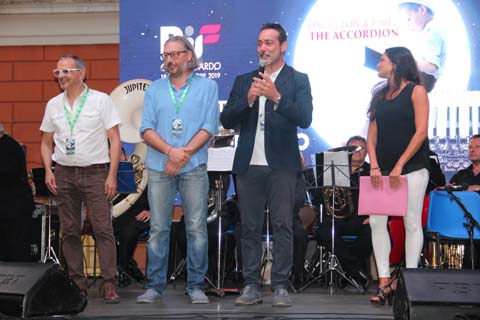 | Enrico Cetrari/President of the organisation Gervasio Marcosignori presenting the fabulous evening in presence of the Mayor Roberto Ascani. | ... the city hall councillor Ruben Cittadini and right, the Artistic Director of the 44th PIF Castelfidardo M° Renzo Ruggieri. |