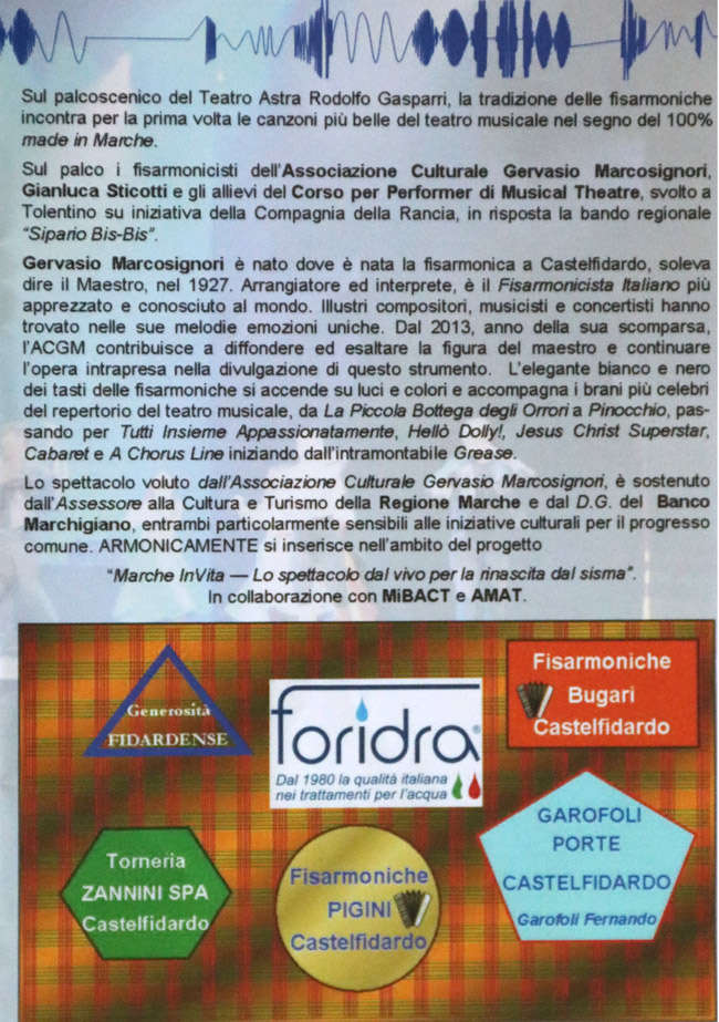 | A musical in honor of the great Maestro Gervasio Marcosignori from Castelfidardo, who died in 2013. | |