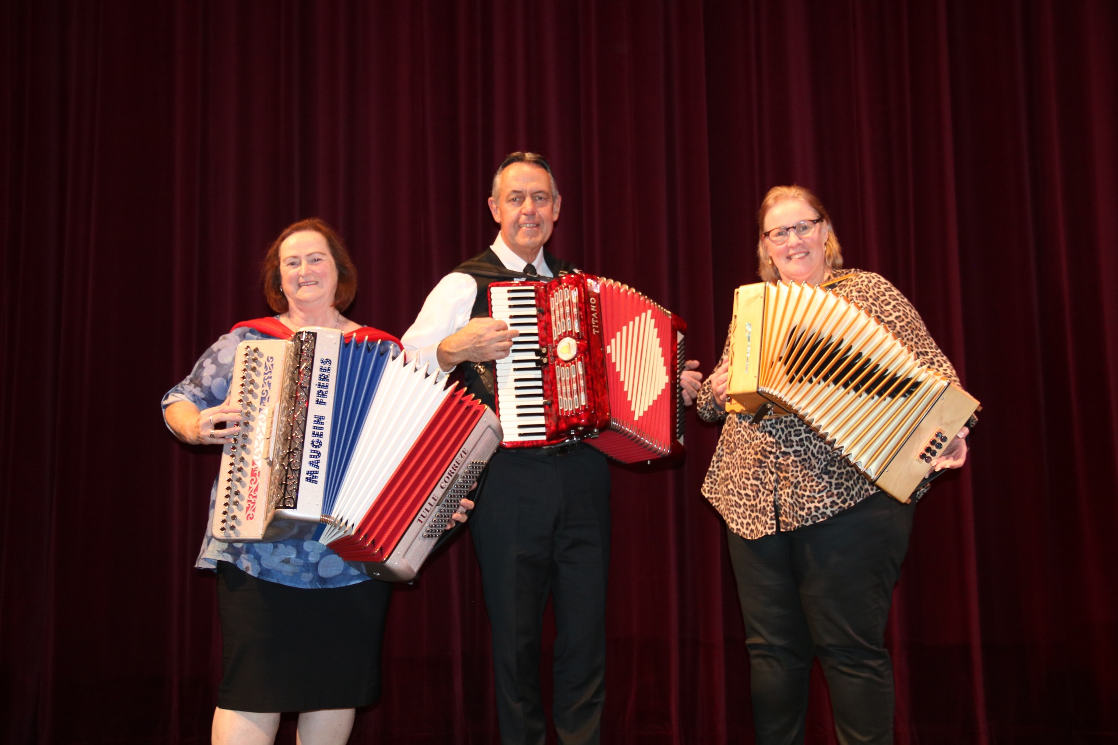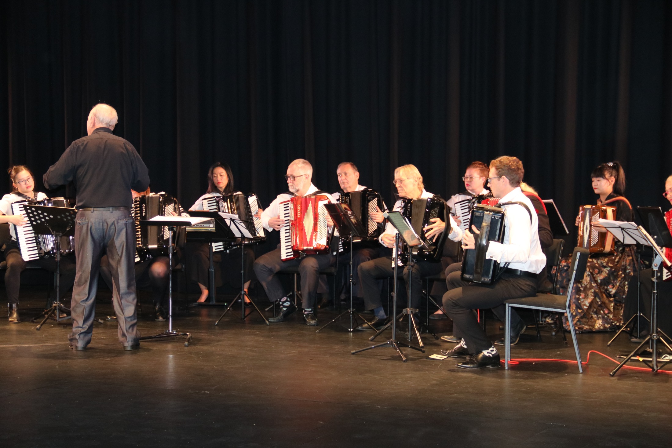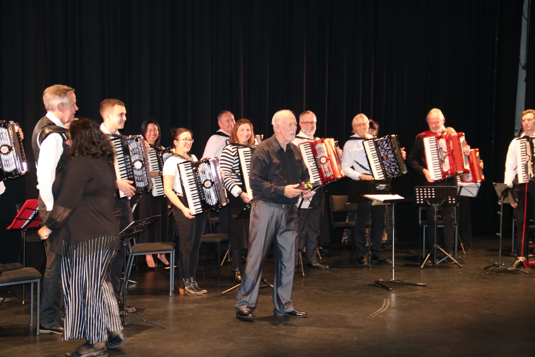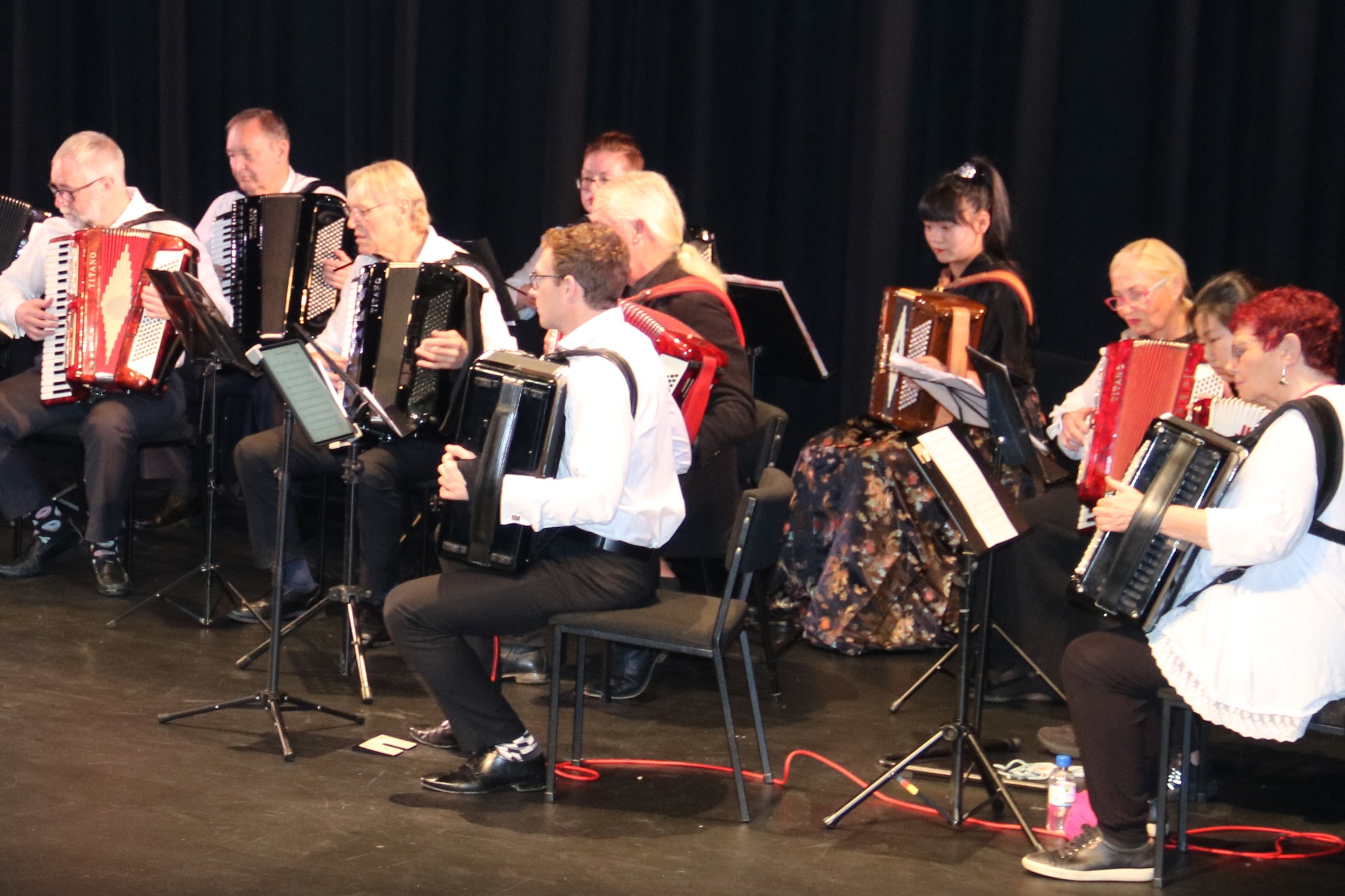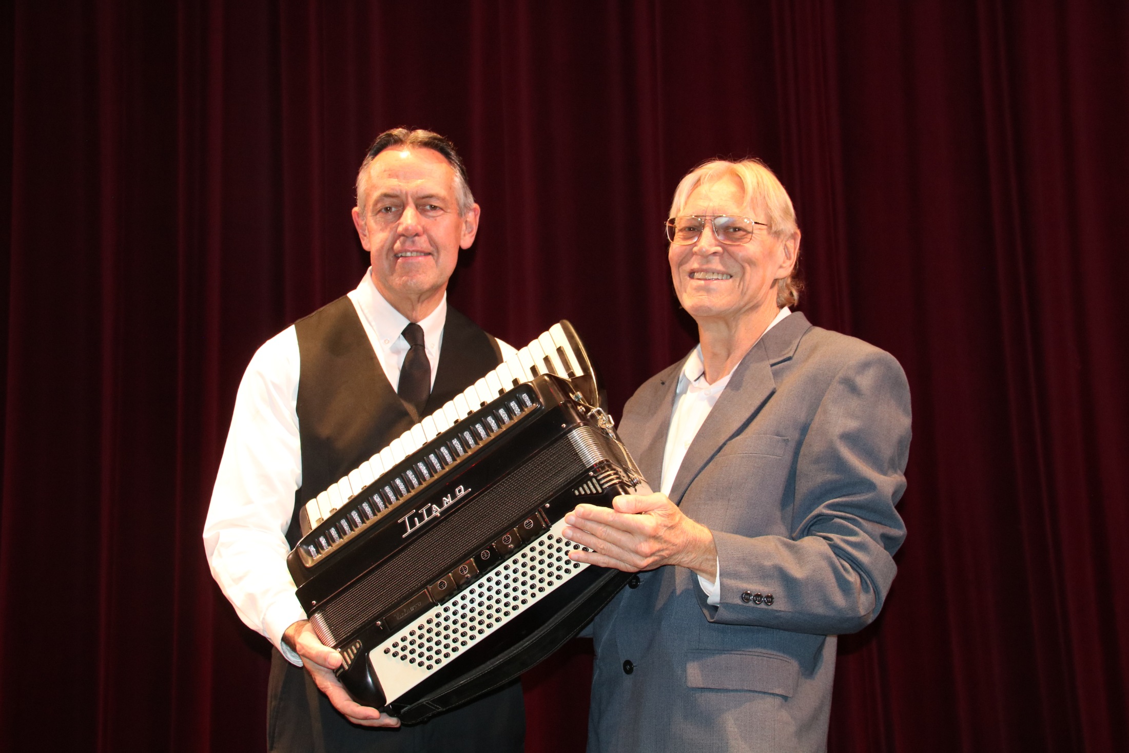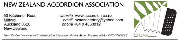 Description of pictures: 121 to 130 NZAA Massed Orchestra - Conductor Gary Daverne ONZM, First Accordion: Kevin Friedrich. The Massed orchestra performed Vienne composed by J Schrammel arranged by Gary Daverne and Orange Blossom Special also arranged by Gary Daverne. 131 Ketong Liu (China), winner of the SP250 12 years and under South Pacific Championships 132 Ketong Liu with her cup presentation. 133 Sven Balvan Q217, Own Composition Open Solo and Entertainment Solo, 16 years and over performed one of his compositions. 134 Introduction by Heather Gladstone of the French Edit Piaff performance by Kevin Friedrich with Ros Gilmour (vocalist). Kevin featured three historic instruments from the Accordion Gems collection at the Dargaville Museum. 135 and 136 featured the one off French flag colors historic accordion with special button/piano treble key layout. 137 Ros Gilmour 138 Kevin Friedrich introducing the NZ Kauri wood diatonic accordion. 139 duo with Linda Emmett Litt (percussion). 140 showing off the NZ fern image on the bellow. 141 Ros Gilmour 142 performing Jambalaya with the historic first accordion owned by Kevin Friedrich that was later owned by renowned radio entertainer Frank Vilich. 143 Andre Samatoi winner of the South Pacific Class SP252, South Pacific Accordion Solo Championship. 144 Andre Samatoi cup presentation. 145 - 150 NZAA Life Membership presentation to Marcel Riethmann. See Citation below. To end the concert was the North Shore Accordion Orchestra of 10 players, performing Menuett by Boccheerini and Baveria Medley arranged by Gary Daverne. NSAO Orchestra 153 Presentation by Maurice Jones to Kevin Friedrich of the first Titano accordion imported into New Zealand in 1957. This instrument is in original condition, never renovated and still plays well. Maurice had located the instrument in the South Island and purchased it for the Accordion Gems Museum display in Dargaville. 154 Kevin and school friends Lorraine Nielsen, Kevin Friedrich, Fiona Cocurullo 155 Ivy Du presenting teacher Heather Gladstone and husband Miki with some food delicasies to enjoy over the weekend. |