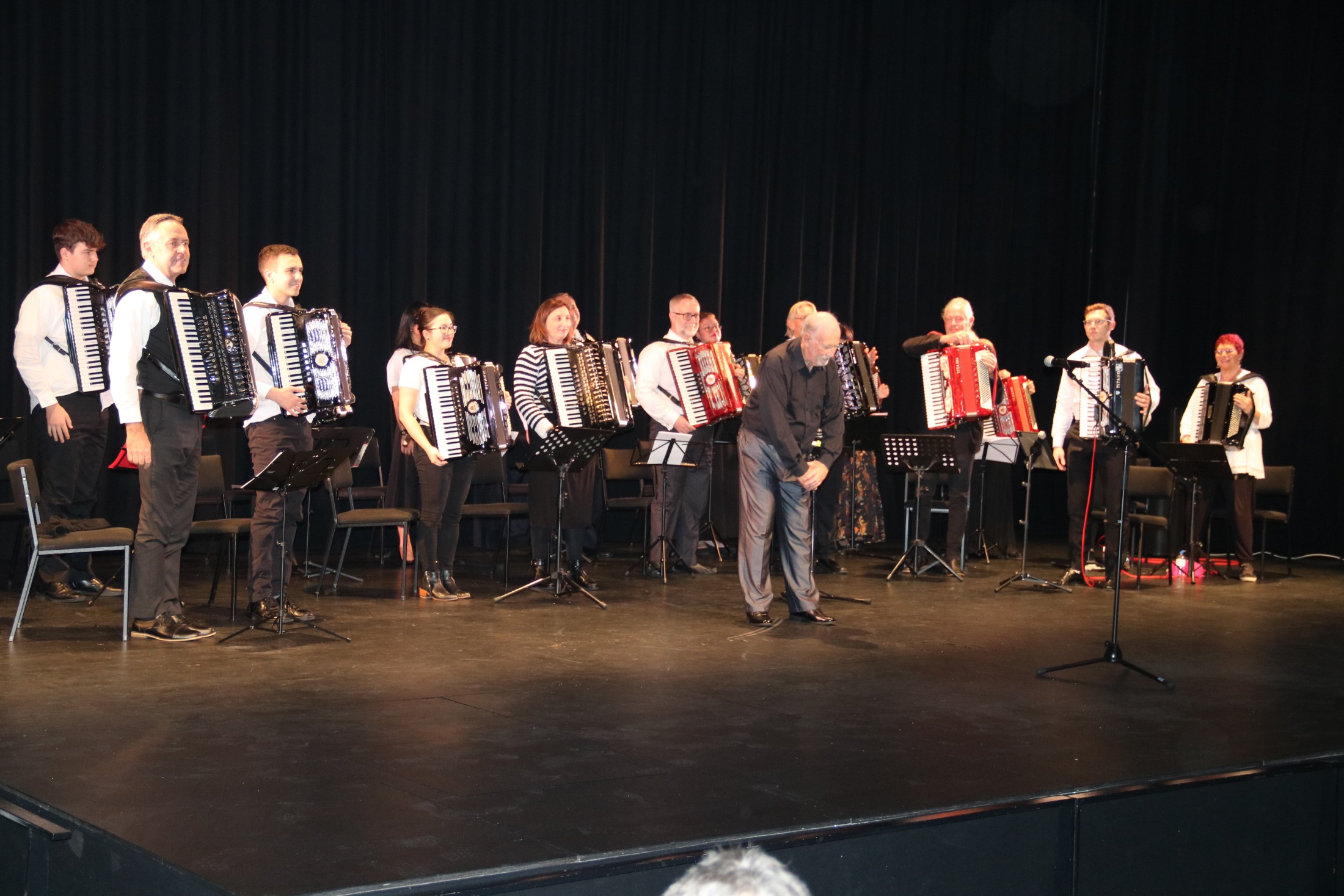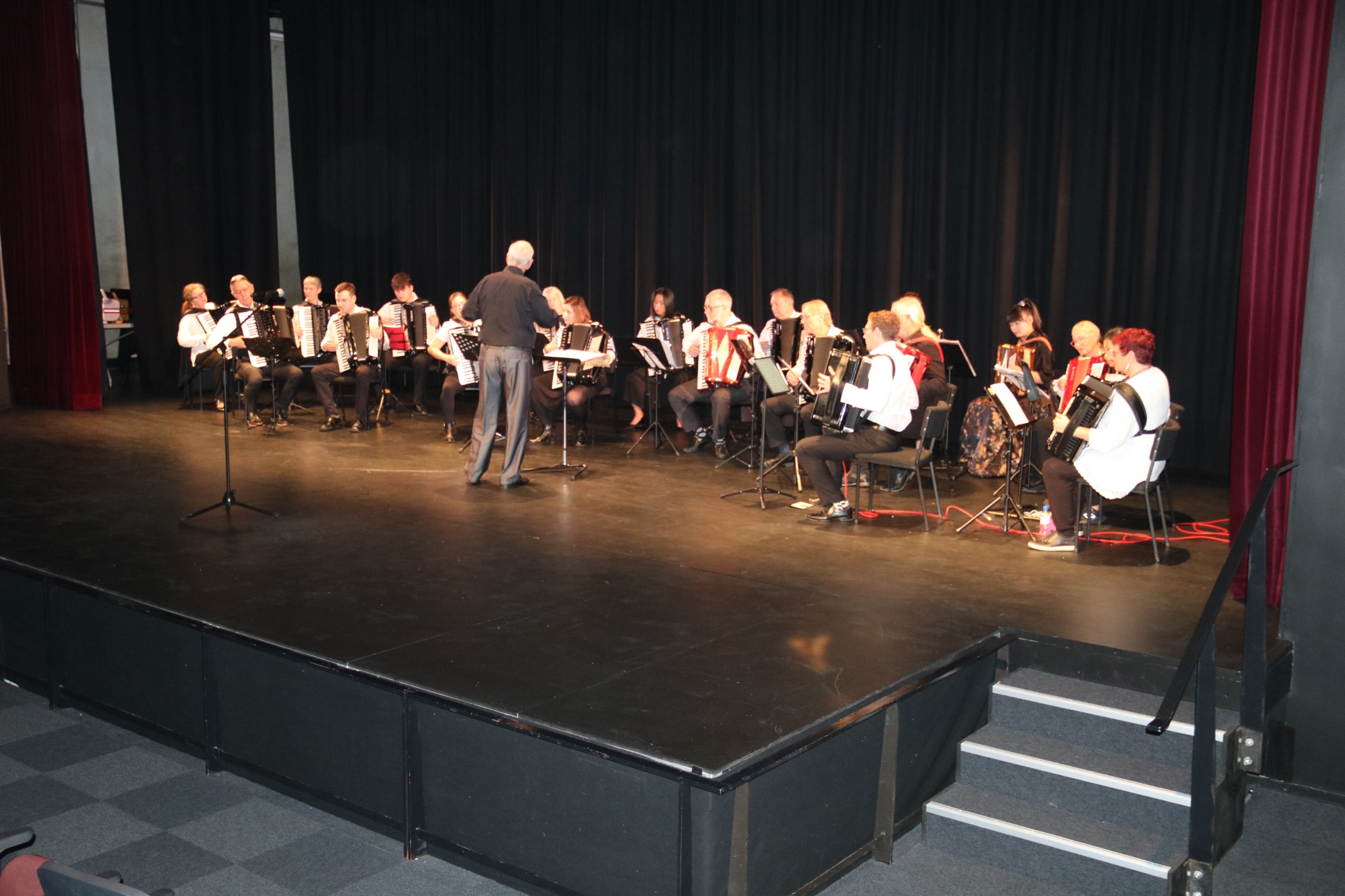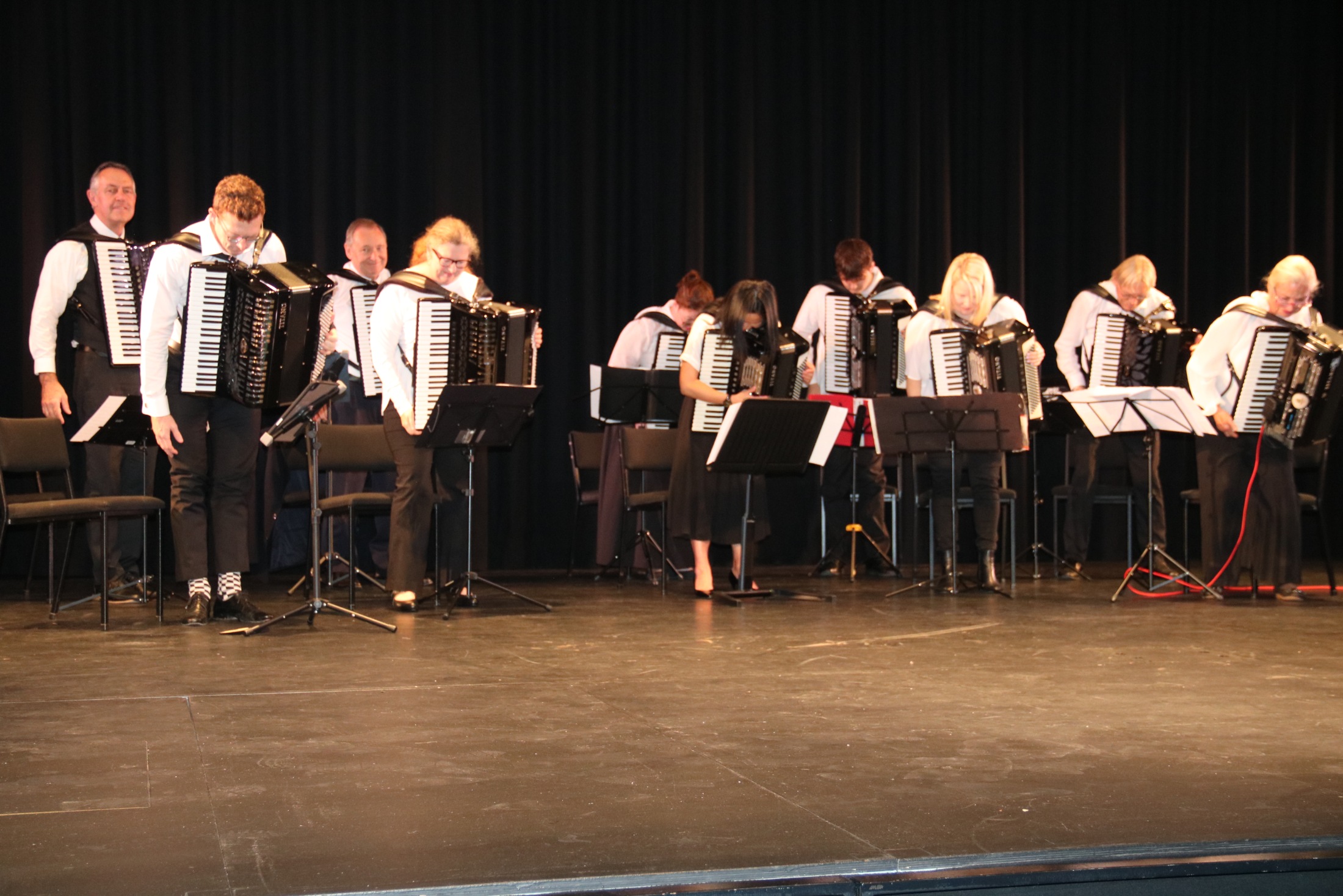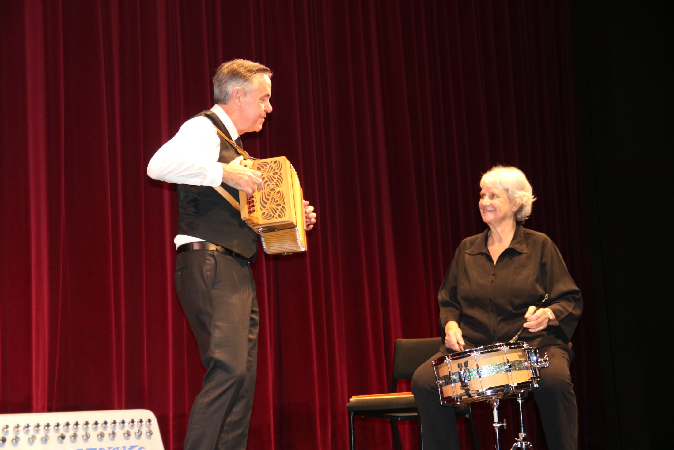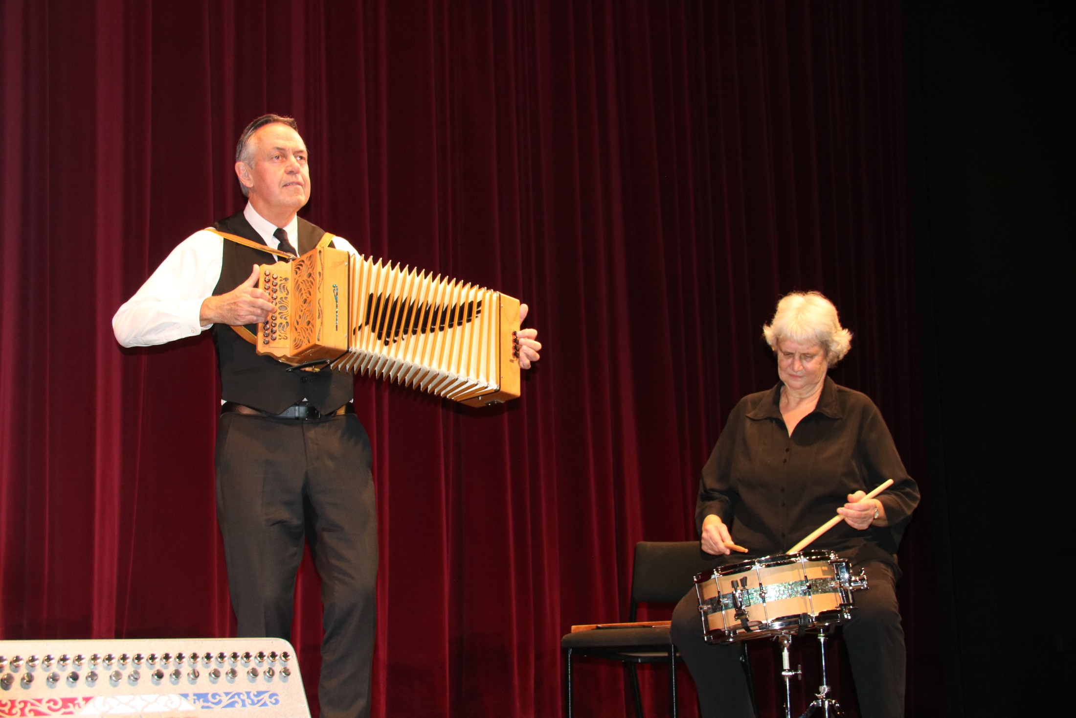 Description of pictures: 121 to 130 NZAA Massed Orchestra - Conductor Gary Daverne ONZM, First Accordion: Kevin Friedrich. The Massed orchestra performed Vienne composed by J Schrammel arranged by Gary Daverne and Orange Blossom Special also arranged by Gary Daverne. 131 Ketong Liu (China), winner of the SP250 12 years and under South Pacific Championships 132 Ketong Liu with her cup presentation. 133 Sven Balvan Q217, Own Composition Open Solo and Entertainment Solo, 16 years and over performed one of his compositions. 134 Introduction by Heather Gladstone of the French Edit Piaff performance by Kevin Friedrich with Ros Gilmour (vocalist). Kevin featured three historic instruments from the Accordion Gems collection at the Dargaville Museum. 135 and 136 featured the one off French flag colors historic accordion with special button/piano treble key layout. 137 Ros Gilmour 138 Kevin Friedrich introducing the NZ Kauri wood diatonic accordion. 139 duo with Linda Emmett Litt (percussion). 140 showing off the NZ fern image on the bellow. 141 Ros Gilmour 142 performing Jambalaya with the historic first accordion owned by Kevin Friedrich that was later owned by renowned radio entertainer Frank Vilich. 143 Andre Samatoi winner of the South Pacific Class SP252, South Pacific Accordion Solo Championship. 144 Andre Samatoi cup presentation. 145 - 150 NZAA Life Membership presentation to Marcel Riethmann. See Citation below. To end the concert was the North Shore Accordion Orchestra of 10 players, performing Menuett by Boccheerini and Baveria Medley arranged by Gary Daverne. NSAO Orchestra 153 Presentation by Maurice Jones to Kevin Friedrich of the first Titano accordion imported into New Zealand in 1957. This instrument is in original condition, never renovated and still plays well. Maurice had located the instrument in the South Island and purchased it for the Accordion Gems Museum display in Dargaville. 154 Kevin and school friends Lorraine Nielsen, Kevin Friedrich, Fiona Cocurullo 155 Ivy Du presenting teacher Heather Gladstone and husband Miki with some food delicasies to enjoy over the weekend. |