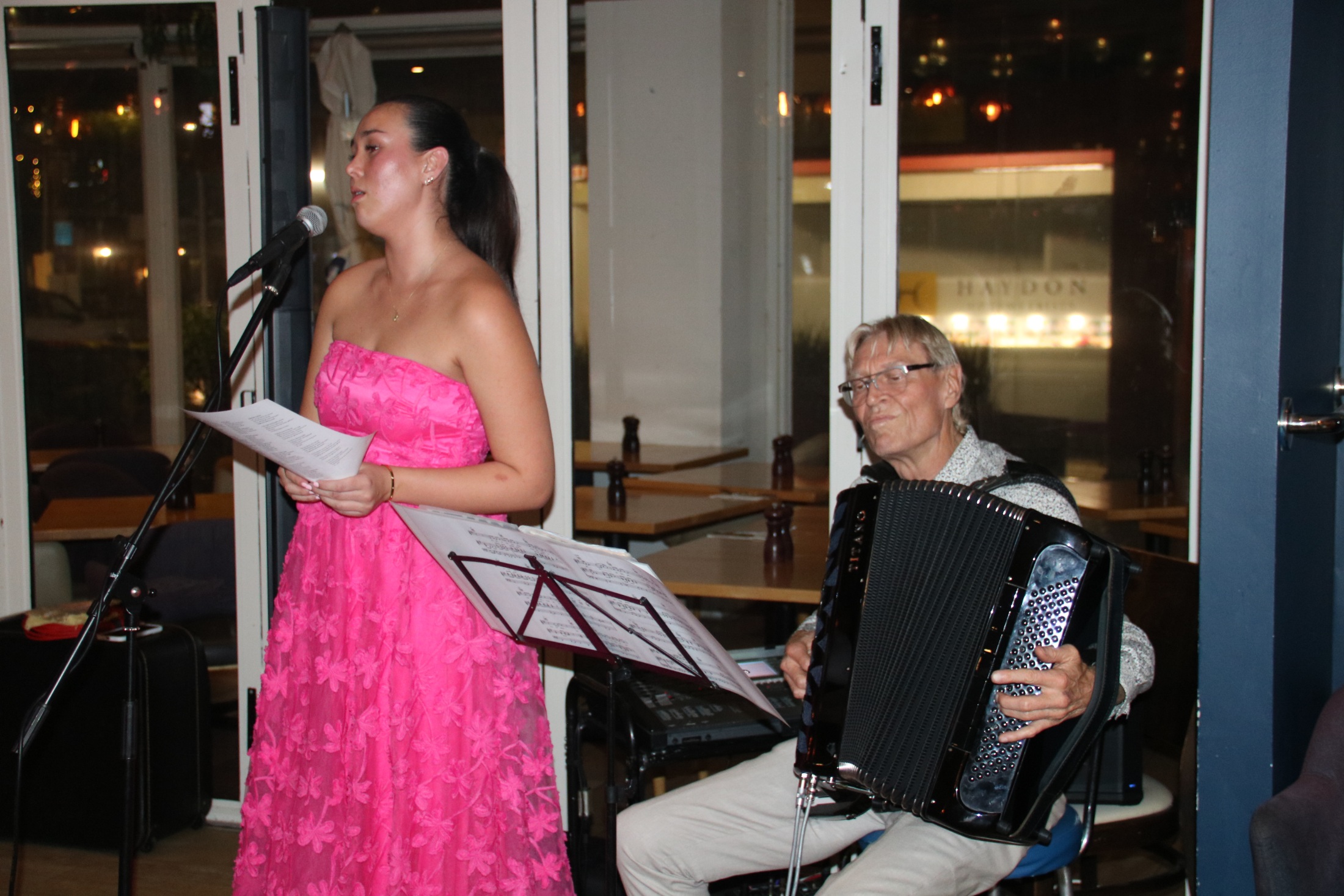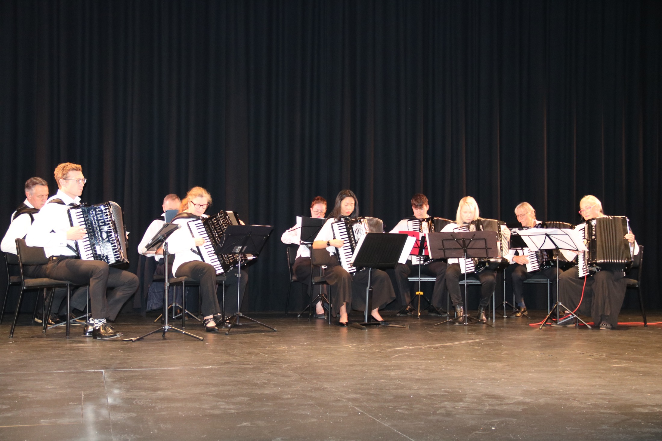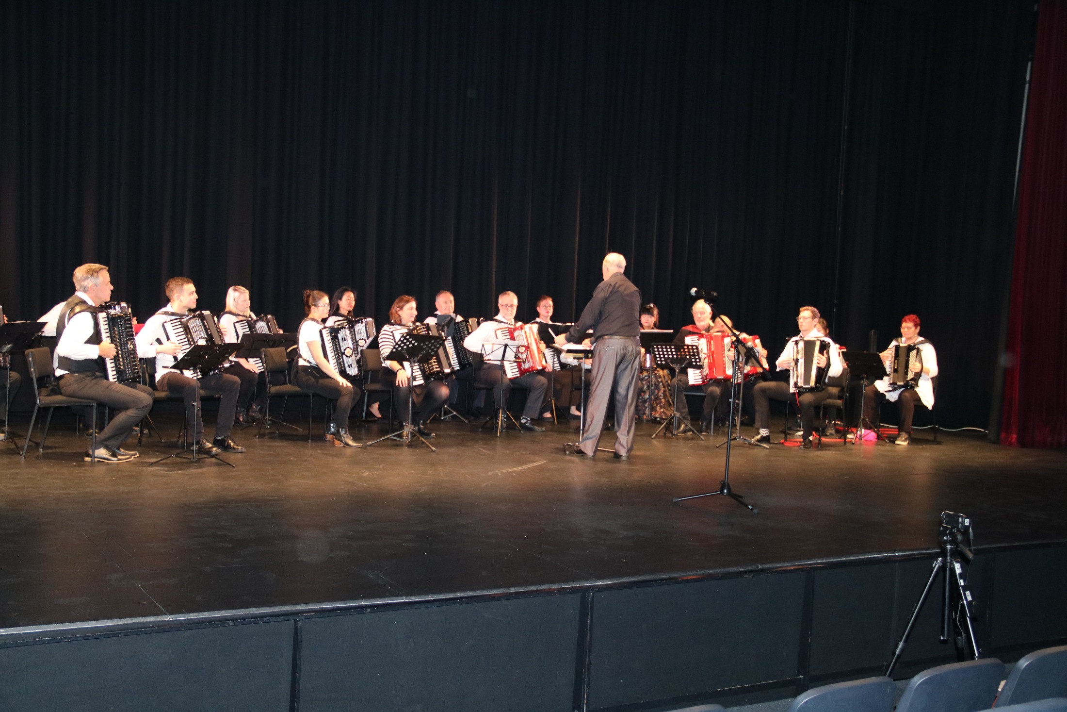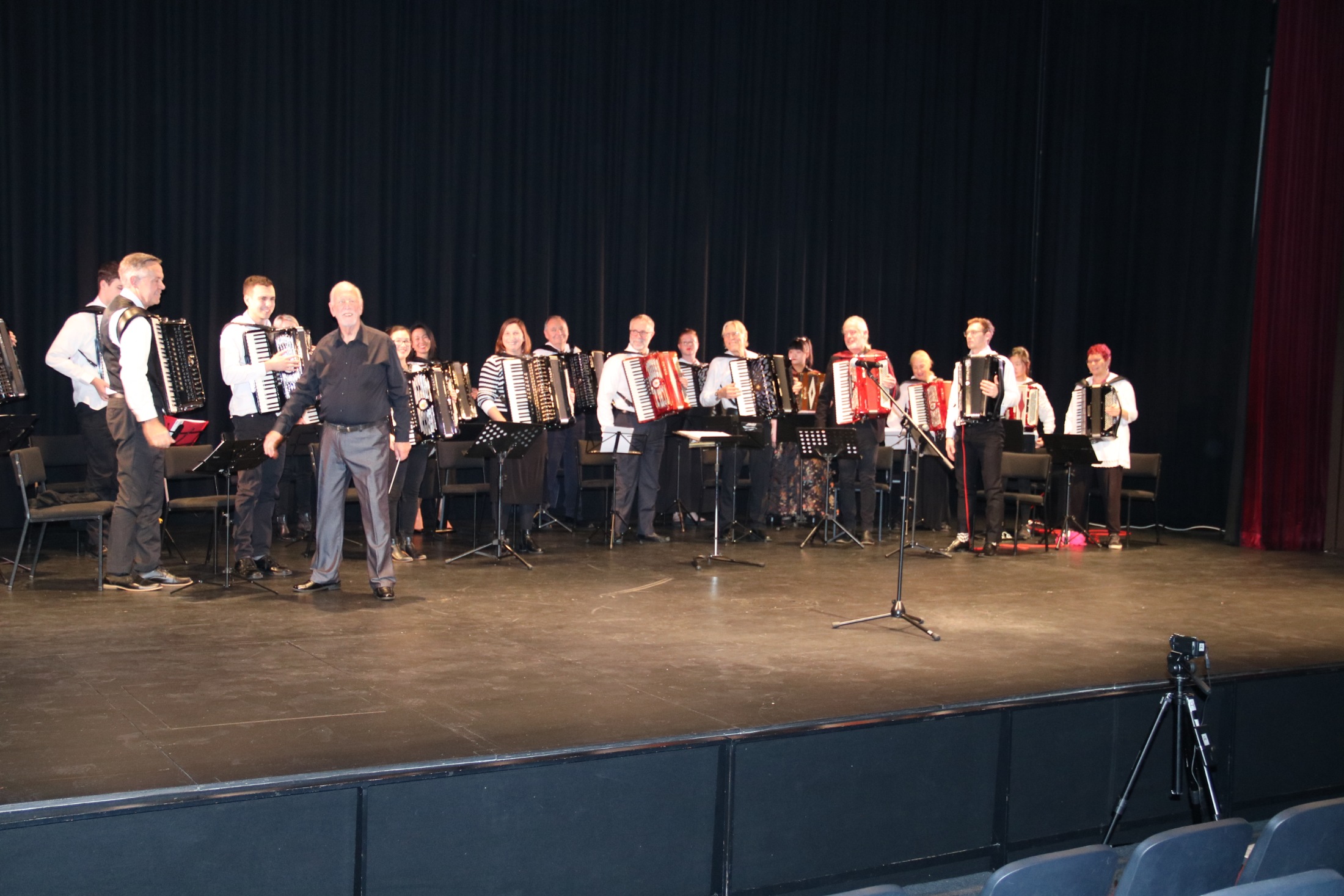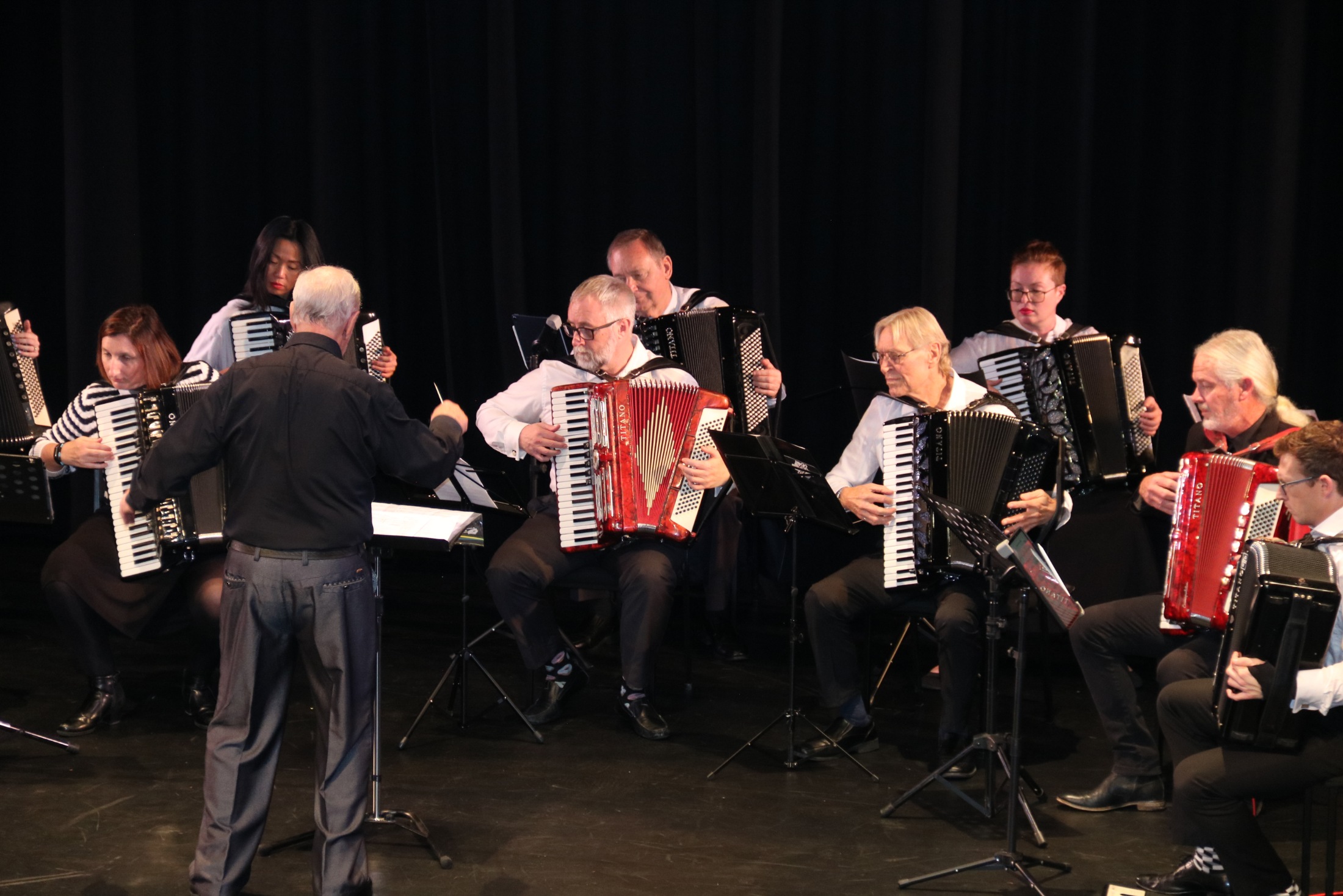 Description of pictures: 121 to 130 NZAA Massed Orchestra - Conductor Gary Daverne ONZM, First Accordion: Kevin Friedrich. The Massed orchestra performed Vienne composed by J Schrammel arranged by Gary Daverne and Orange Blossom Special also arranged by Gary Daverne. 131 Ketong Liu (China), winner of the SP250 12 years and under South Pacific Championships 132 Ketong Liu with her cup presentation. 133 Sven Balvan Q217, Own Composition Open Solo and Entertainment Solo, 16 years and over performed one of his compositions. 134 Introduction by Heather Gladstone of the French Edit Piaff performance by Kevin Friedrich with Ros Gilmour (vocalist). Kevin featured three historic instruments from the Accordion Gems collection at the Dargaville Museum. 135 and 136 featured the one off French flag colors historic accordion with special button/piano treble key layout. 137 Ros Gilmour 138 Kevin Friedrich introducing the NZ Kauri wood diatonic accordion. 139 duo with Linda Emmett Litt (percussion). 140 showing off the NZ fern image on the bellow. 141 Ros Gilmour 142 performing Jambalaya with the historic first accordion owned by Kevin Friedrich that was later owned by renowned radio entertainer Frank Vilich. 143 Andre Samatoi winner of the South Pacific Class SP252, South Pacific Accordion Solo Championship. 144 Andre Samatoi cup presentation. 145 - 150 NZAA Life Membership presentation to Marcel Riethmann. See Citation below. To end the concert was the North Shore Accordion Orchestra of 10 players, performing Menuett by Boccheerini and Baveria Medley arranged by Gary Daverne. NSAO Orchestra 153 Presentation by Maurice Jones to Kevin Friedrich of the first Titano accordion imported into New Zealand in 1957. This instrument is in original condition, never renovated and still plays well. Maurice had located the instrument in the South Island and purchased it for the Accordion Gems Museum display in Dargaville. 154 Kevin and school friends Lorraine Nielsen, Kevin Friedrich, Fiona Cocurullo 155 Ivy Du presenting teacher Heather Gladstone and husband Miki with some food delicasies to enjoy over the weekend. |