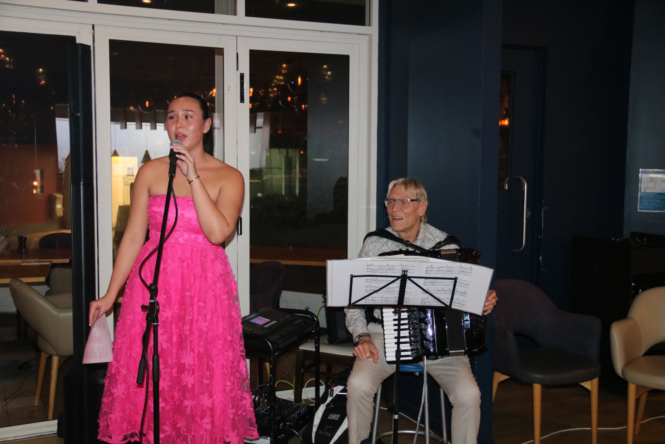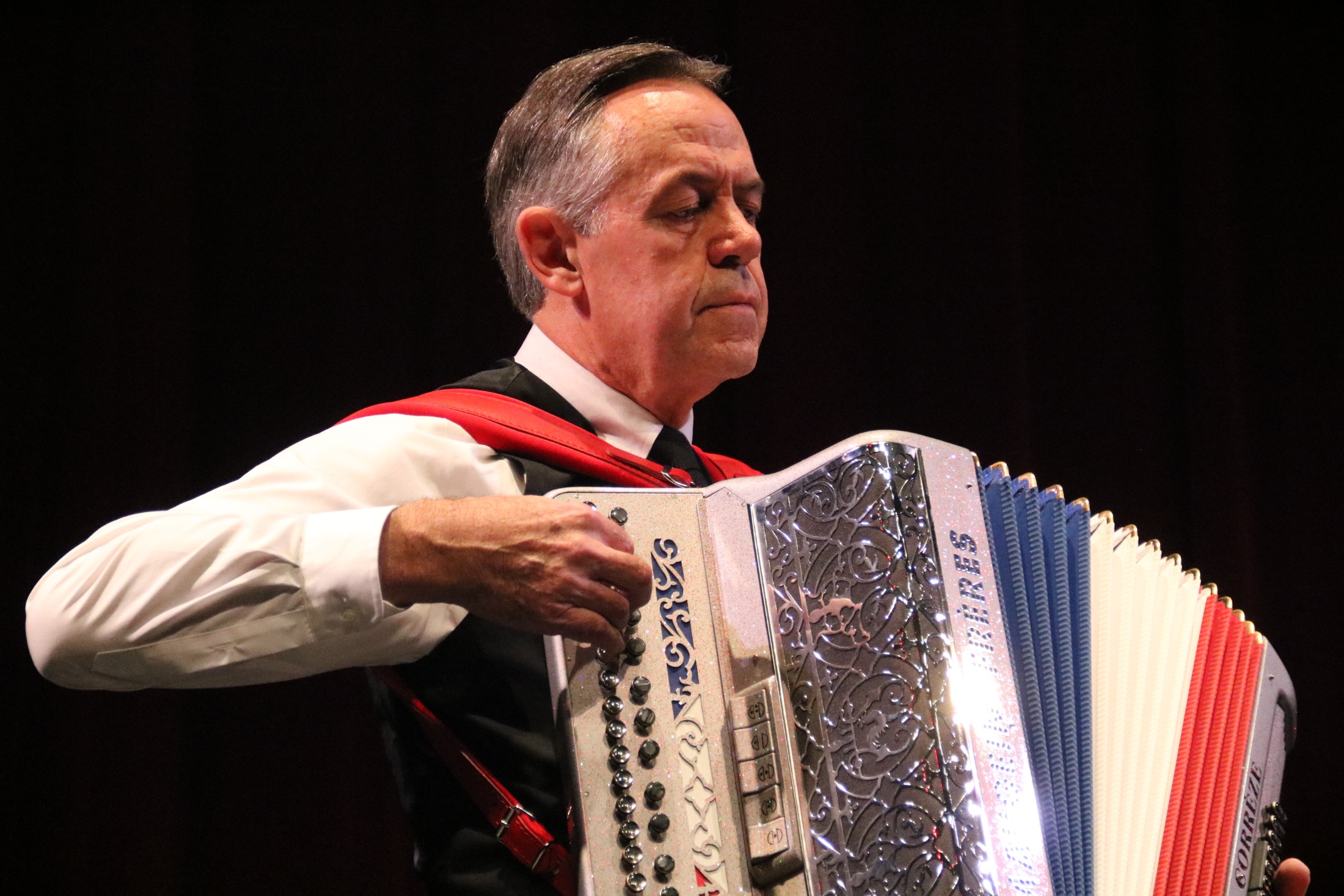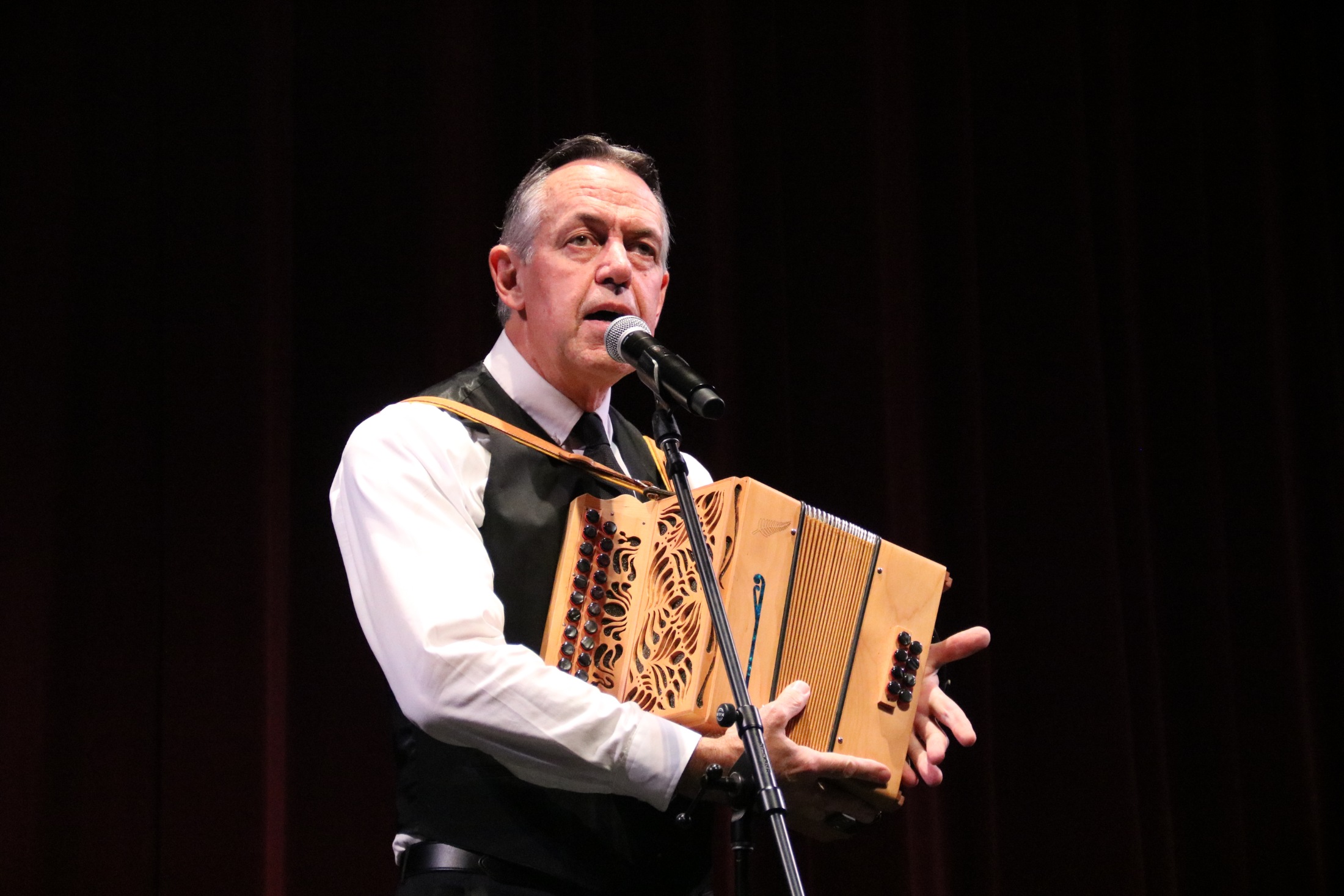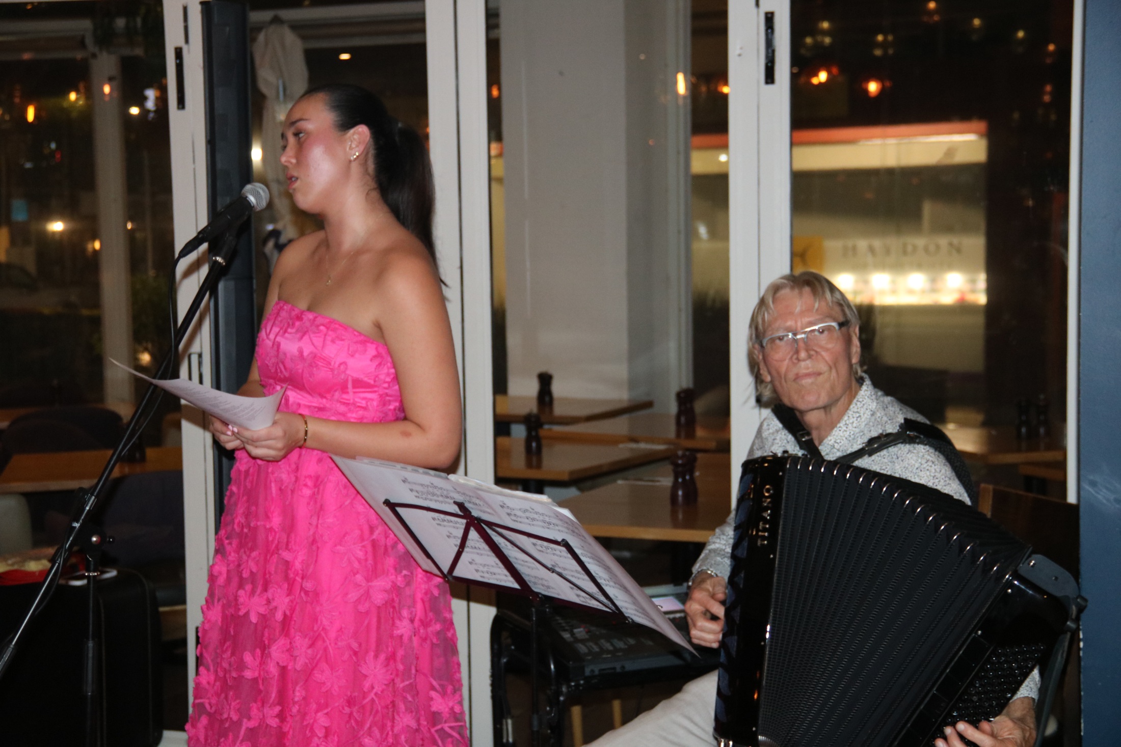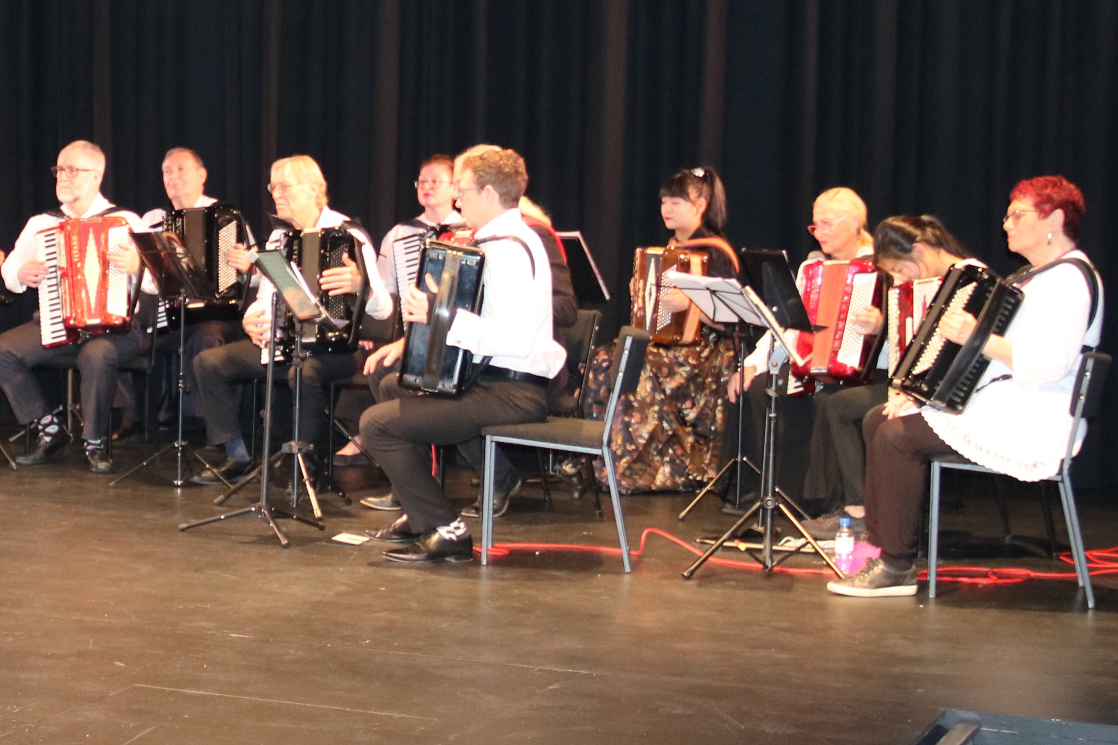 Description of pictures: 121 to 130 NZAA Massed Orchestra - Conductor Gary Daverne ONZM, First Accordion: Kevin Friedrich. The Massed orchestra performed Vienne composed by J Schrammel arranged by Gary Daverne and Orange Blossom Special also arranged by Gary Daverne. 131 Ketong Liu (China), winner of the SP250 12 years and under South Pacific Championships 132 Ketong Liu with her cup presentation. 133 Sven Balvan Q217, Own Composition Open Solo and Entertainment Solo, 16 years and over performed one of his compositions. 134 Introduction by Heather Gladstone of the French Edit Piaff performance by Kevin Friedrich with Ros Gilmour (vocalist). Kevin featured three historic instruments from the Accordion Gems collection at the Dargaville Museum. 135 and 136 featured the one off French flag colors historic accordion with special button/piano treble key layout. 137 Ros Gilmour 138 Kevin Friedrich introducing the NZ Kauri wood diatonic accordion. 139 duo with Linda Emmett Litt (percussion). 140 showing off the NZ fern image on the bellow. 141 Ros Gilmour 142 performing Jambalaya with the historic first accordion owned by Kevin Friedrich that was later owned by renowned radio entertainer Frank Vilich. 143 Andre Samatoi winner of the South Pacific Class SP252, South Pacific Accordion Solo Championship. 144 Andre Samatoi cup presentation. 145 - 150 NZAA Life Membership presentation to Marcel Riethmann. See Citation below. To end the concert was the North Shore Accordion Orchestra of 10 players, performing Menuett by Boccheerini and Baveria Medley arranged by Gary Daverne. NSAO Orchestra 153 Presentation by Maurice Jones to Kevin Friedrich of the first Titano accordion imported into New Zealand in 1957. This instrument is in original condition, never renovated and still plays well. Maurice had located the instrument in the South Island and purchased it for the Accordion Gems Museum display in Dargaville. 154 Kevin and school friends Lorraine Nielsen, Kevin Friedrich, Fiona Cocurullo 155 Ivy Du presenting teacher Heather Gladstone and husband Miki with some food delicasies to enjoy over the weekend. |