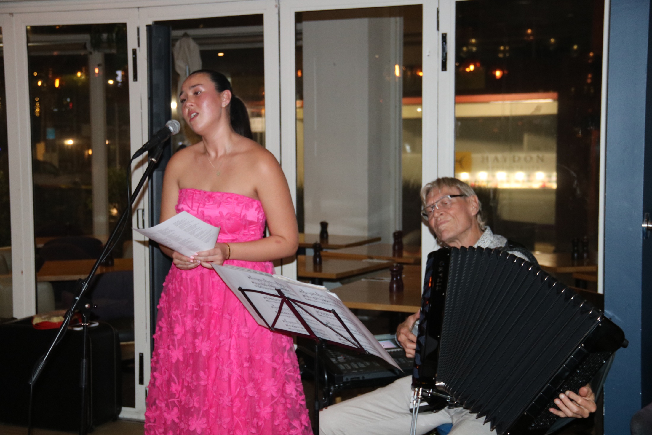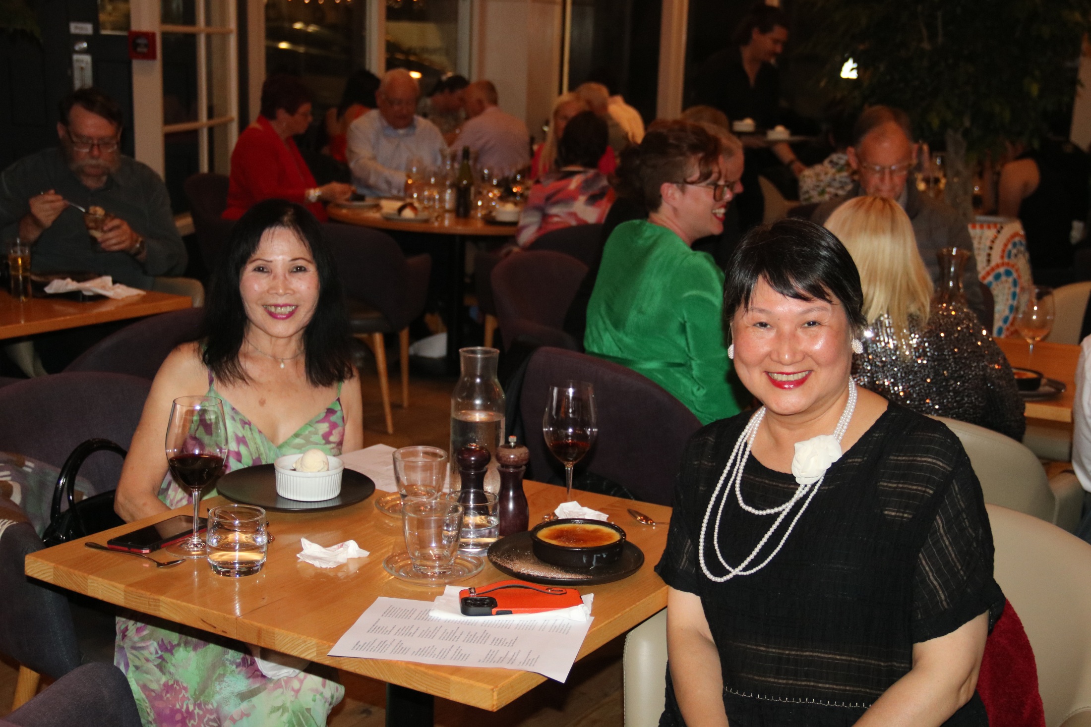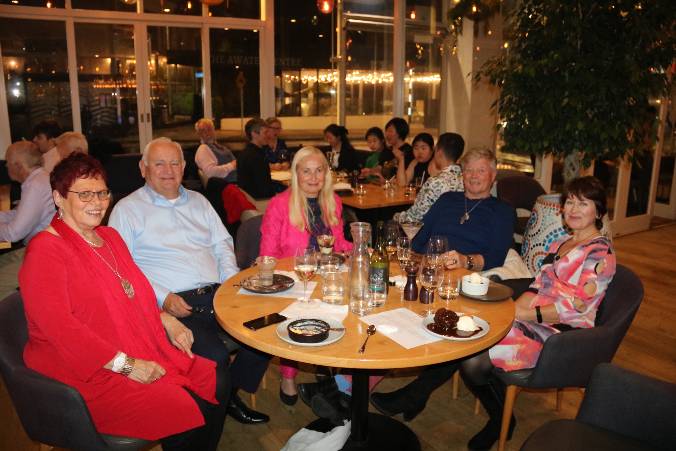 | Description of pictures: The Farewell Dinner was held at Aubergine Restaurant in Takapuna. We have pictures of many attending and the night ended with most on the dance floor enjoying some superb lively dance music. A big thank you to our musicians of the evening Sven Balvan, Stephen Cope, Alanah and Maurice Jones who made the evening a most enjoyable time. |