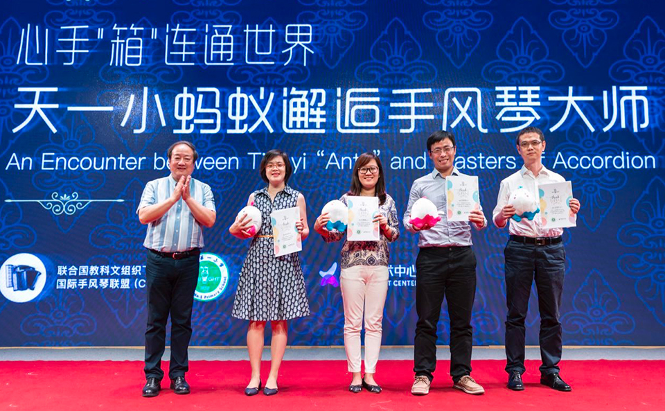 CIA President Mirco Patarini presenting the Plaque certifying the inauguration of the Tianyi Ants Accordion Orchestra to Lu Hua Qiong, Principal of the School |