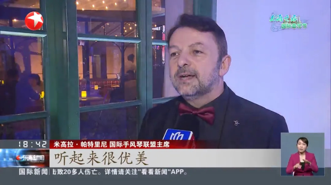 | Dragon TV News Report TV 01. Interview with the 2024 Shanghai Accordion Art Festival organisation leader Crystal Wang. Crystal Wang is also a member of the important Music Committee of the Confédération Internationale des Accordéonistes. TV 02. Interview with President Mirco Patarini (Italy) of the Confédération Internationale des Accordéonistes TV 03. Interview with the youngest international performer Djordje Peric (Bosnia and Herzegovina) TV 04. Interview with Grayson Masefield from New Zealand. |