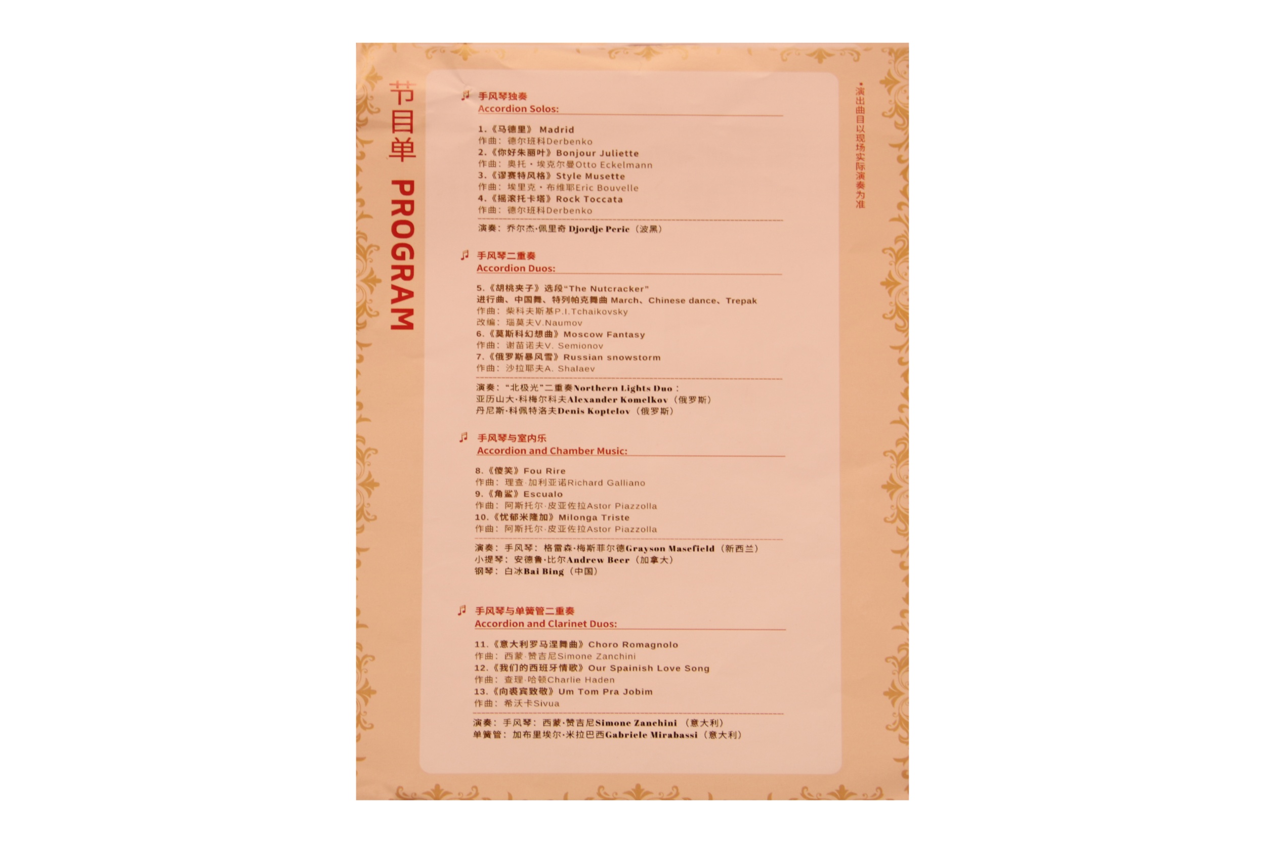| Concert at Ningbo University 01. Program 02. Concert sign outside the hall 03. Northern Lights Duo posing with the concert sign. 04. Confédération Internationale des Accordéonistes Ambassador Kevin Friedrich with Vice Dean of Conservatory of Music Lei Wang who learnt accordion from an early age and today is a famous teacher online of music education with many thousands of followers. |