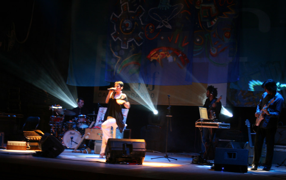 | The band in action with Mafalda singing and percussion here. | |