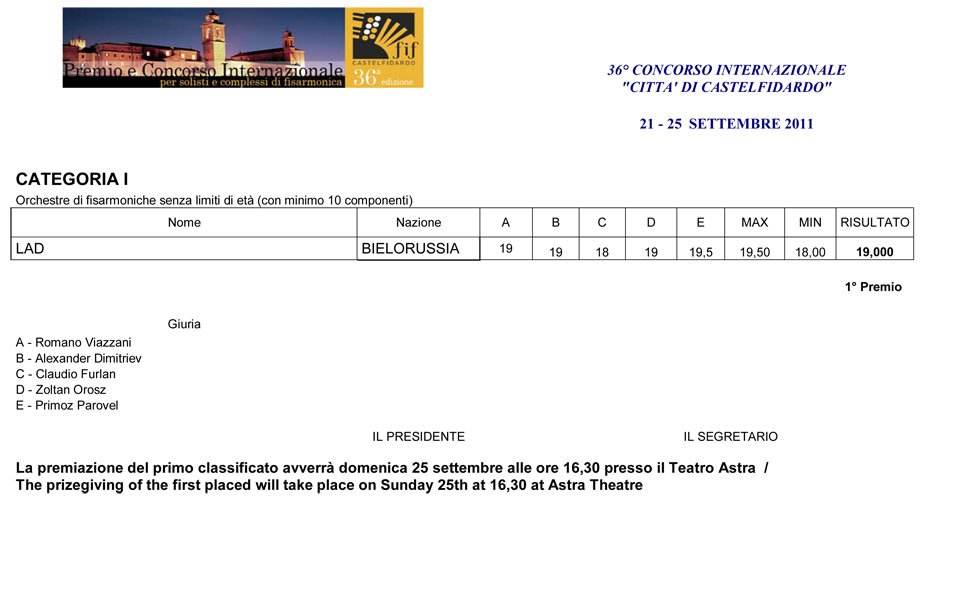 | Category I Results Accordion orchestras, without age limit (with a minimum of 10 components including the rhythmic section) with a predominantly classical repertoire. - Unique audition The contestants in category I should present a programme of their choice lasting no more than 40 minutes. In addition to the artistic trophy (to the first three classified), special prizes will be awarded by the organizers, as well as the following scholarships (gross): euro 2.000,00 to the first placed orchestra + “Accordions Worldwide” Special Prize euro 1.200,00 to the second placed orchestra euro 800,00 to the third placed orchestra euro 500,00 to the fourth placed orchestra euro 300,00 to the fifth placed orchestra |