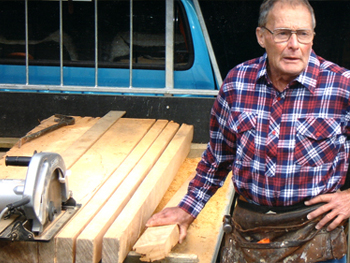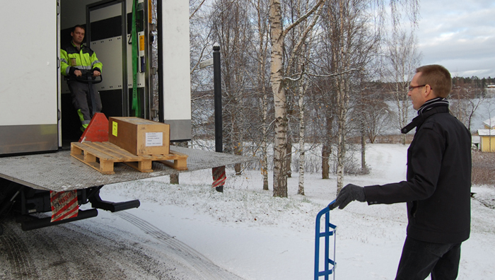 Mattila inspecting the wood as it is unpacked in Ikaalinen