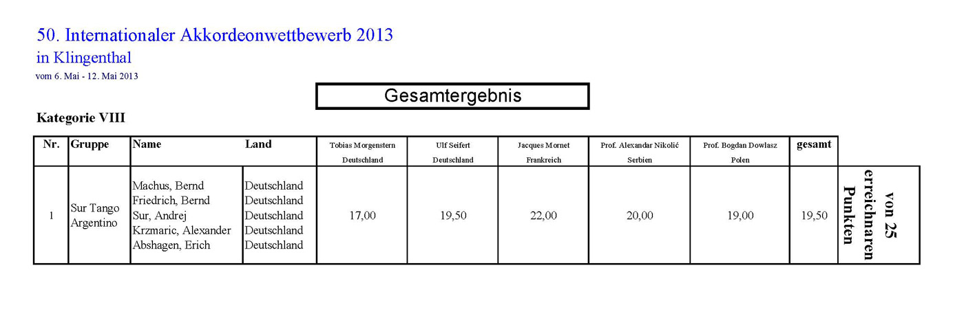 | Members of the Hof Accordion Orchestra Julian Feulner and Christoph Plass with Kevin Friedrich, Holda Paoletti-Kampl and Klingenthal Akkordeonwettbewerb Director Manfred Gäbler. | Prof. Jürgen Ganzer (Germany - Head of Jury) with Bogdan Dowlasz (Poland). |
