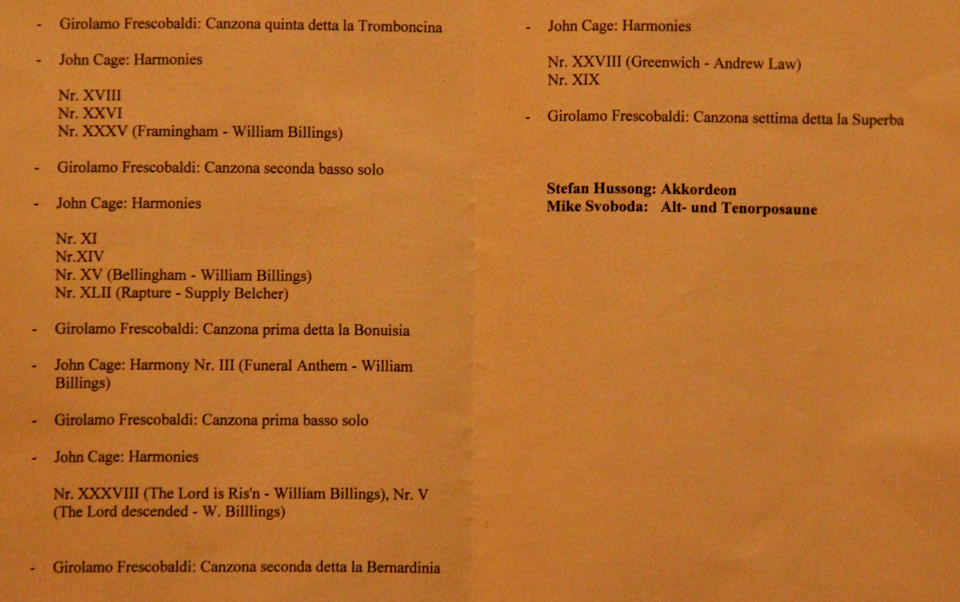 | Program of about 50 mins, without interval, with many movements. It was interesting having Frescobaldi to start and finish the program wth John Cage and Frescobaldi compositions throughout the program. |