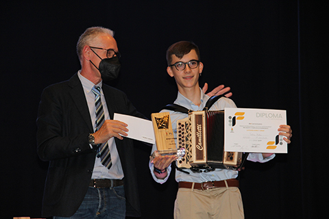 | Eugenio Bennato in Castelfidardo and how could he not perform also on a Castelfidardo ACCORDION (which he learned to play when young)? At this occasion he also awarded the youngest competitor of the International Accordion Prize: Francesco Gorga from Policastro (Salerno) - only 8 years old, winner in the World Music Student category. |