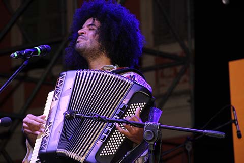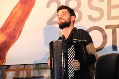 Ruben Cittadini with Mestrinho and the musicians performing with him later in the evening concert in the Piazza della Repubblica of Castelfidardo